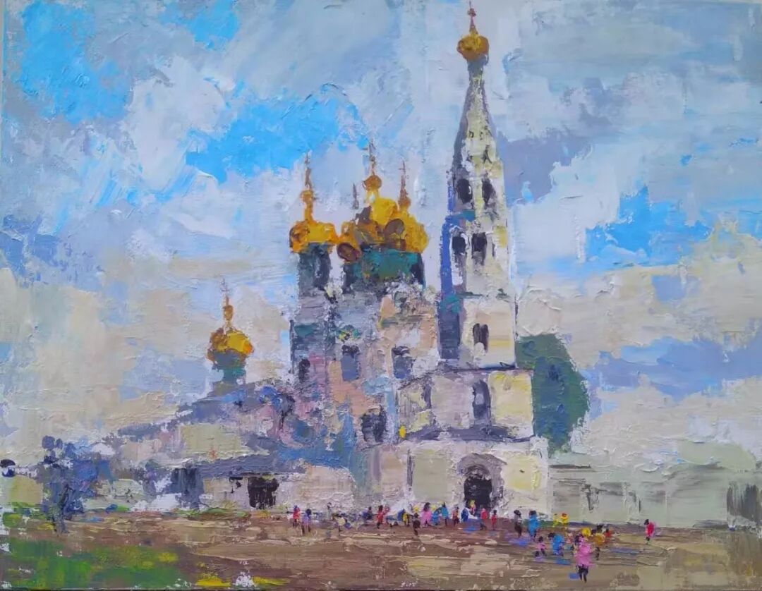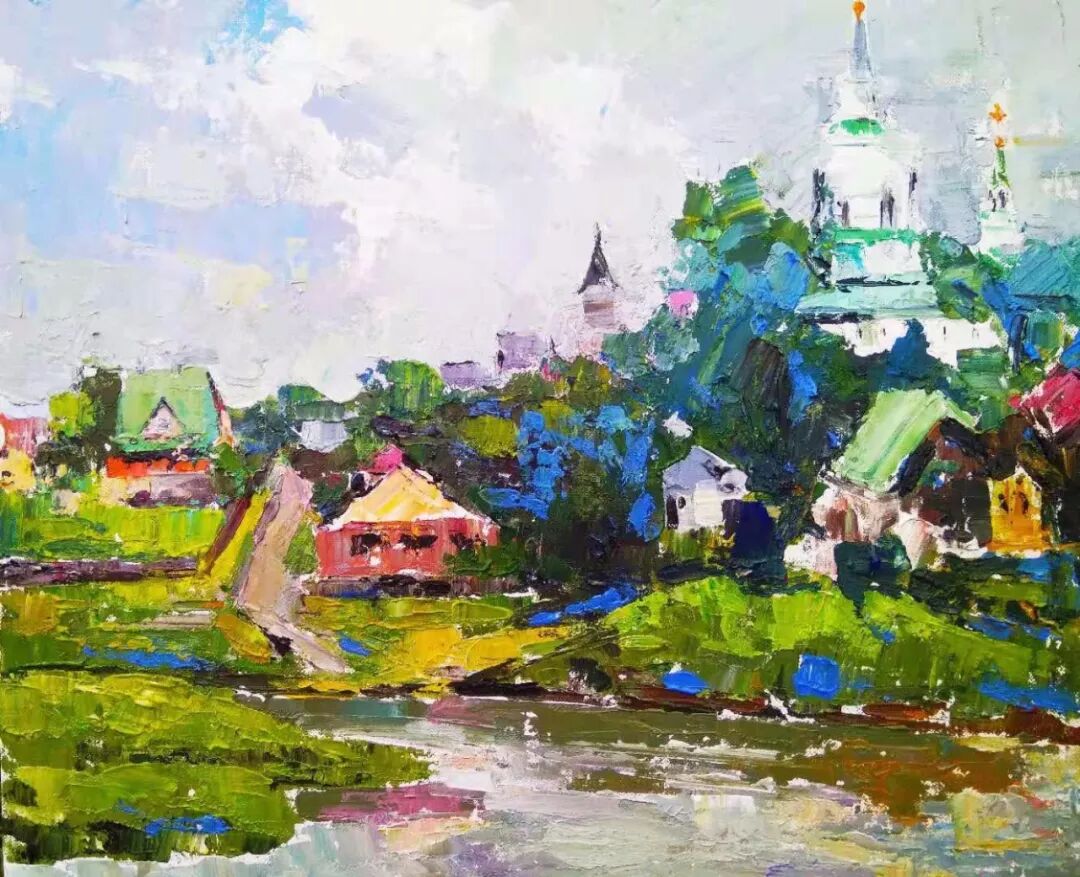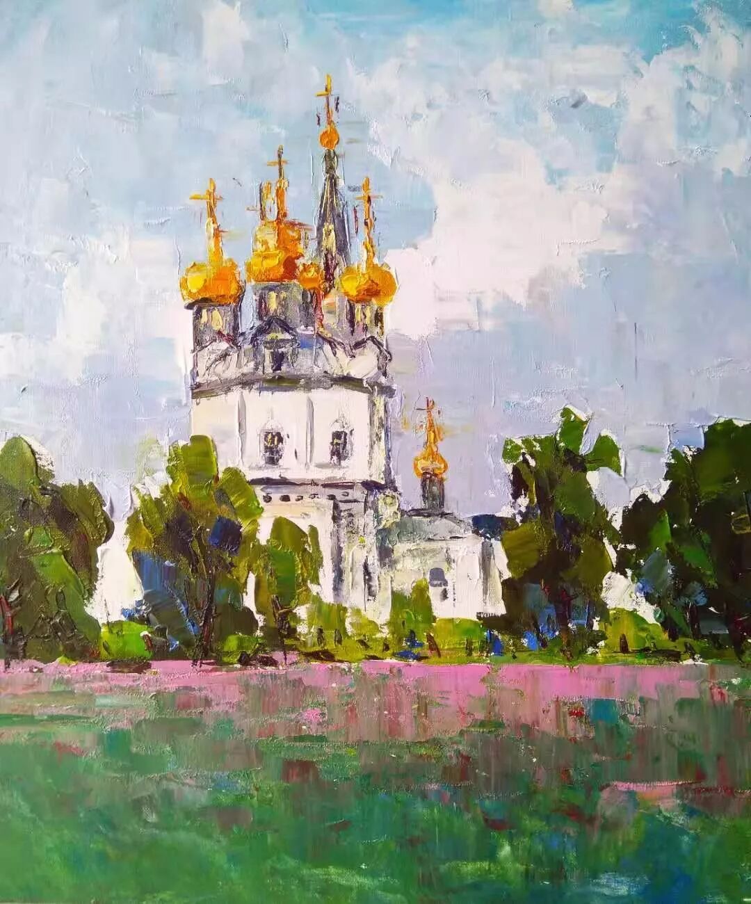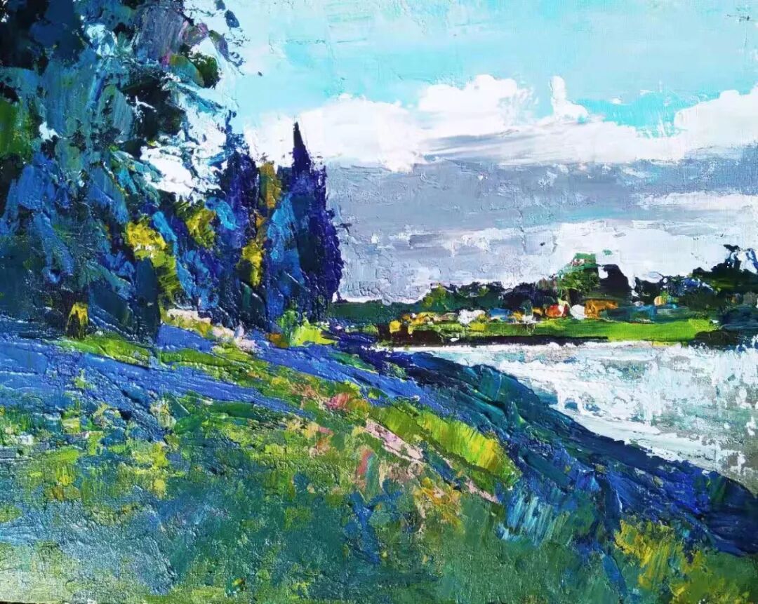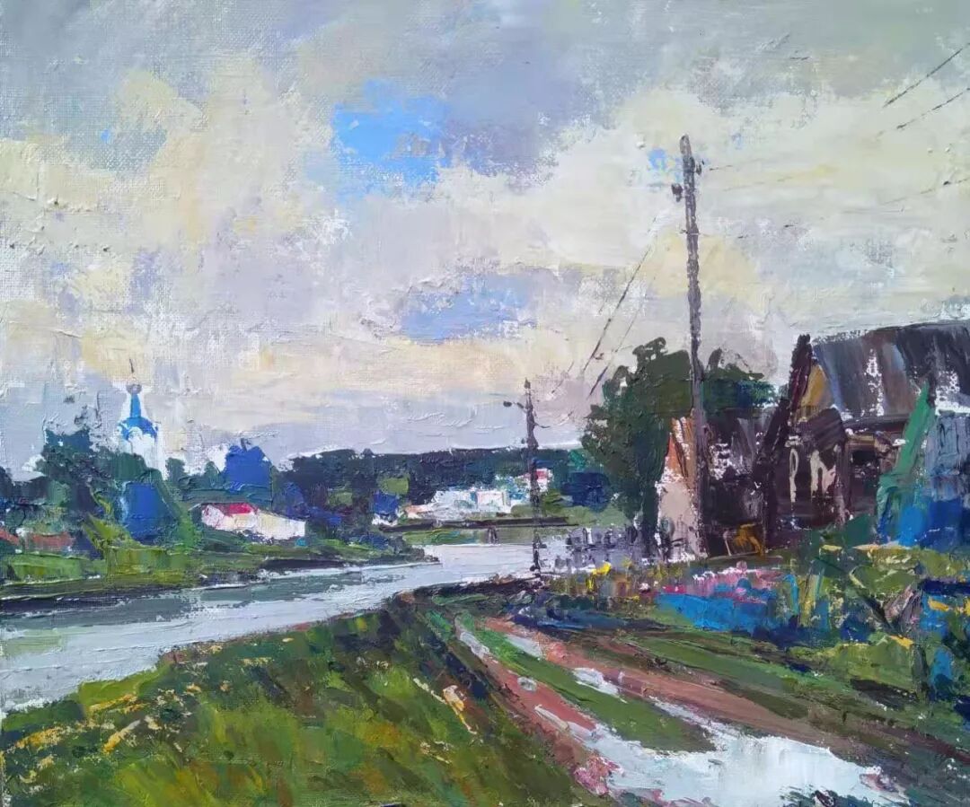 陈敏的艺术实践,始终以“写生”为核心支点。在他的创作经历中,2019年俄罗斯叶卡捷琳堡·维尔霍图里耶写生之旅极具代表性——这场由《当代油画》策划的学术性写生活动,不仅是一次技法交流,更是一次艺术家集体对“写生本质”的探索。十几天的早出晚归,艺术家们在田野、丛林、河畔支起画架,将眼前的自然景致转化为画布上的色彩肌理;而每日晚餐后的画作点评环节,则成为思想碰撞的“学术沙龙”,从构图的取舍到色彩的情感表达,从笔触的力度到画面的整体气息,每一次交流都推动着创作者跳出“模仿自然”的局限,走向“主动组织画面形式语言”的高阶创作。