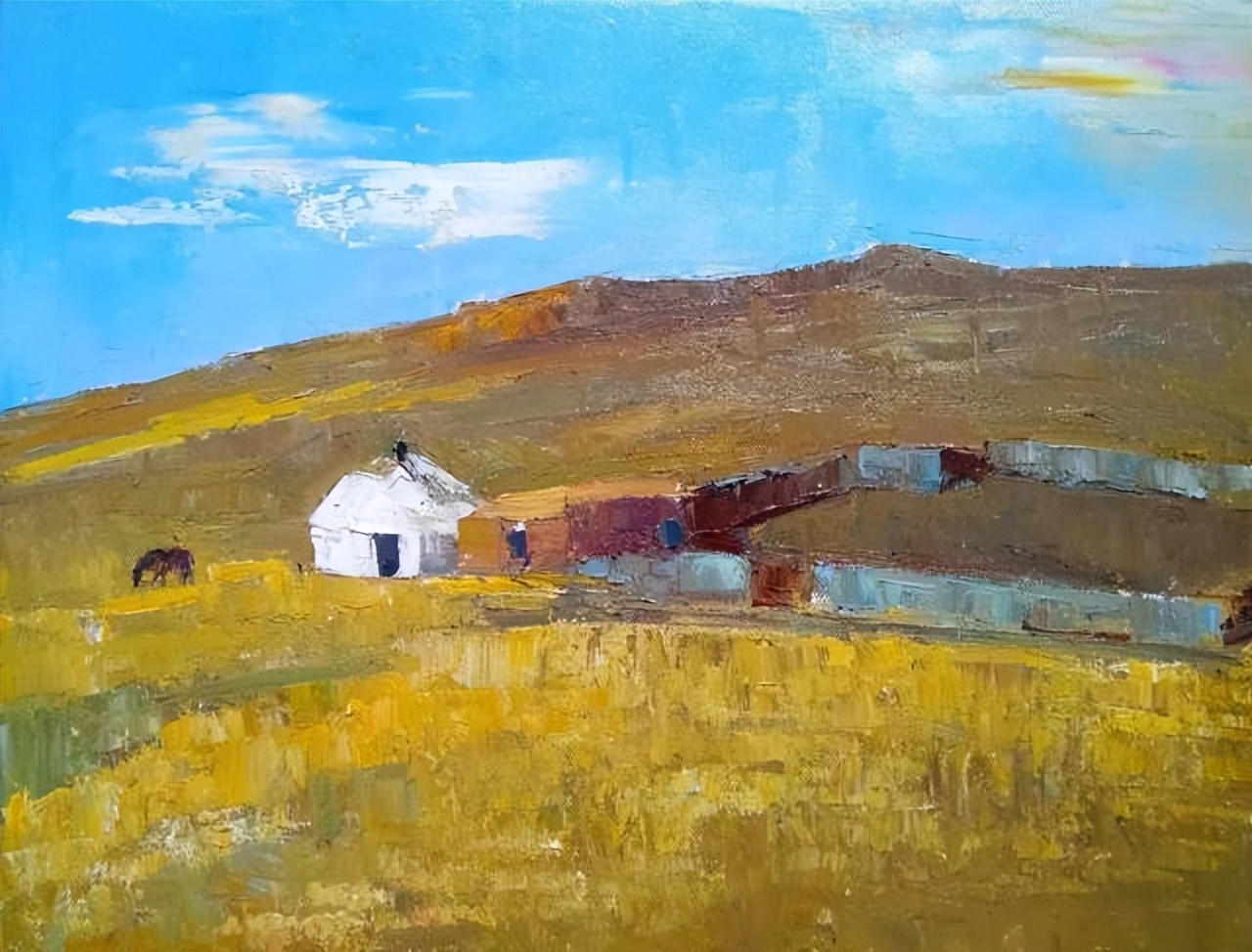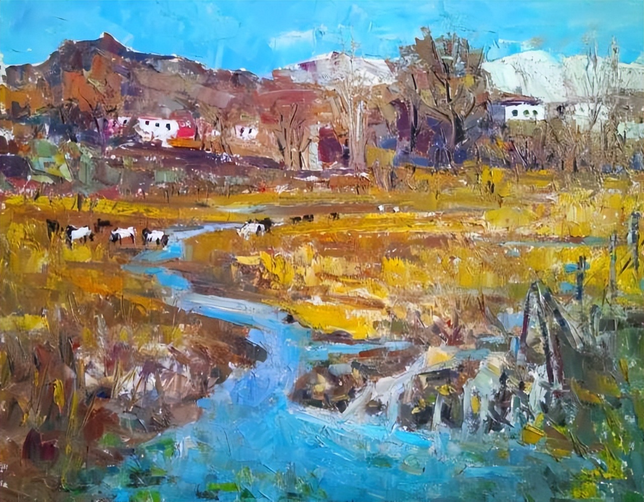 陈敏对此有着深刻的体悟,他在自述中提到:“当我支起画架,挤出颜料的同时,都会有一种动情的思绪,面对大自然,如何表现此景此物,此时刻的自己也已进入一种境域。”这种“境域”的生成,正是写生艺术的核心魅力——它并非简单的“写实再现”,而是艺术家将客观自然与主观情感、理性思考与即兴灵感相融合的过程。在无人之境的田野间,他对着蓝天、河流、牛马羊群“呼唤交流”,这种看似“非理性”的互动,实则是艺术家与自然建立情感联结的方式;抽象的情绪与具象的景致在他的感知中相互映照,最终转化为画布上独有的“气息与味道”。正如他所言,从模仿到重构的探索“不光是在画内,更是在画外”——画内是技法的锤炼,画外则是对自然的敬畏、对生命的感知,以及对艺术本质的不断追问。