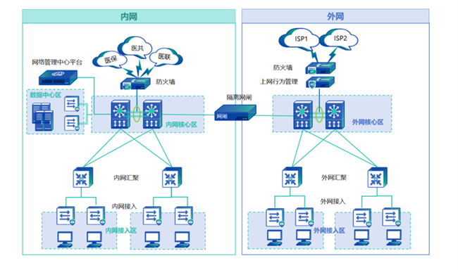 本次方案采用堆叠部署,通过部署信锐高性能核心交换机作为医院内外网核心,保障稳定性与冗余性。在汇聚及接入层,采用信锐安视交换机(图一),进行全网可视化及智能化管理。这套网络方案,既可支撑当前医院电子病历、移动护理等关键业务,同时可以为医院未来5-10年业务发展提供网络保障。