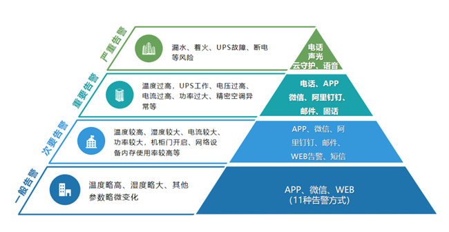 信锐IPSIP基础设施物理安全感知平台对机房动力、环境、安防等系统进行统一监测,测到异常状况后,通过实现Web、APP、微信、电话、短信等方式通知到运维人员(图四),保障对机房状态的实时感知和24小时无人值守。