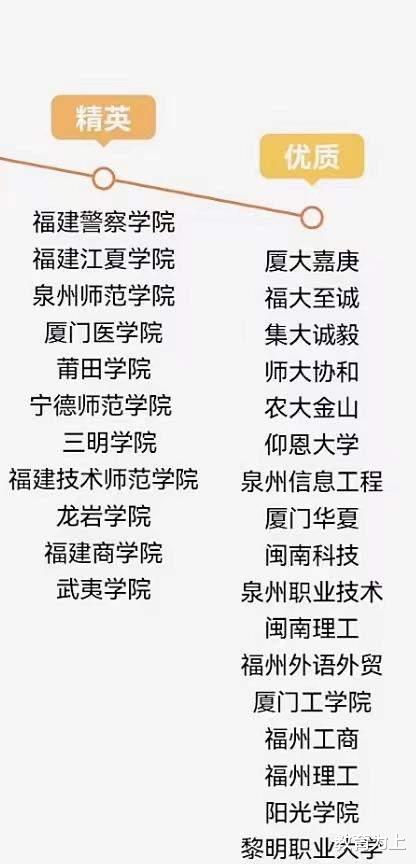 居第三档“精英”档的高校共计11所,包括福建警察学院、泉州师范学院、莆田学院、三明学院等,多为福建省地方高校的典型代表,代表地方高等教育的最高水平。