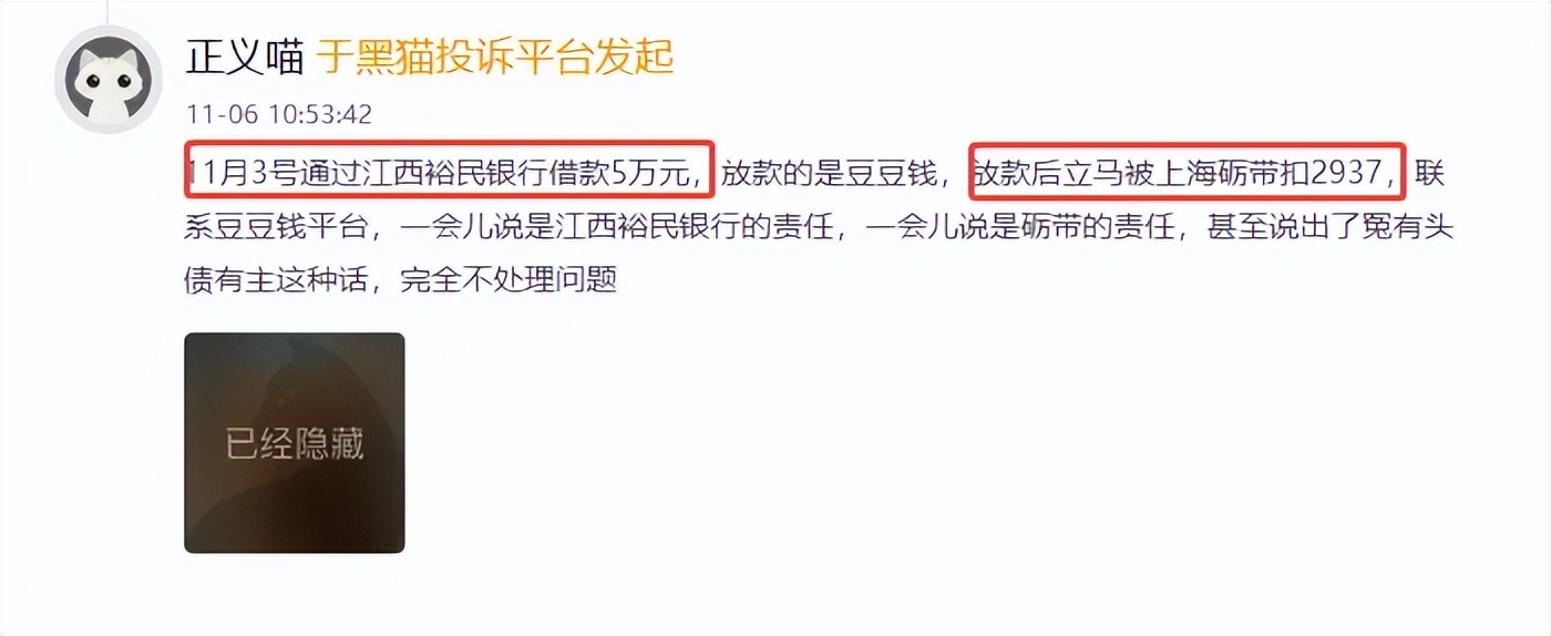 黑猫投诉平台显示:11月6日有网友反映,11月3日通过一平台借款5万元,放款方为江西裕民银行,但放款后立马被“上海砺带”扣走2937元。当用户联系借款平台时,平台方与银行相互推诿责任,问题难以解决。