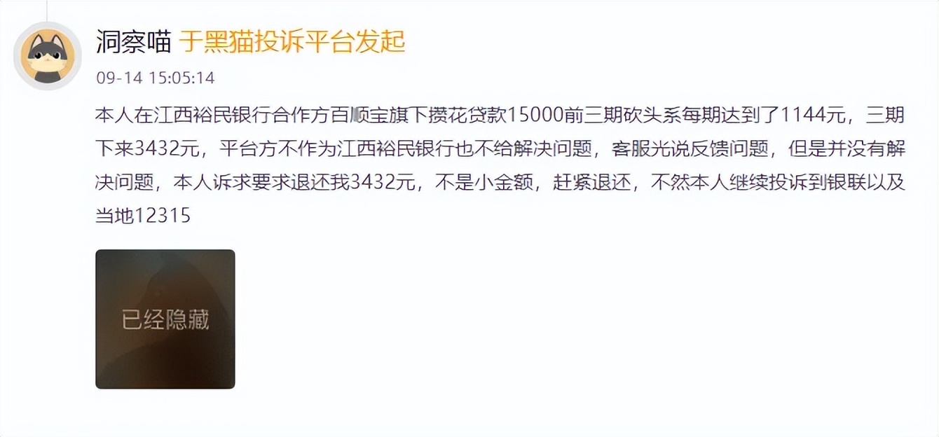 黑猫投诉平台显示:11月17日有网友反映,收取了三期权益费用。及9月14日有网友反映,通过百顺宝申请江西裕民银行放款,前三期共计扣除3432元,不解决问题。