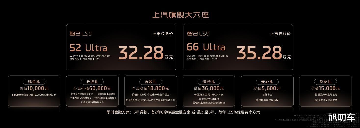 更震撼的是,智己LS9上市权益诚意爆棚,将奢华B&O音响系统、二排右侧4D机械按摩、一体式超广域智慧探射灯、豪华智能电动踏板等配置,统统限时免费升级!新车震撼发布两个超级增程版本:智己LS9 52 Ultra版上市权益价32.28万元,入门即巅峰,以30万出头的价格,享受时代最旗舰的满配大六座;智己LS9 66 Ultra版,更搭载66度宁德时代超级骁遥MAX电池,将续航和性能推向极致,上市权益价35.28万元。
