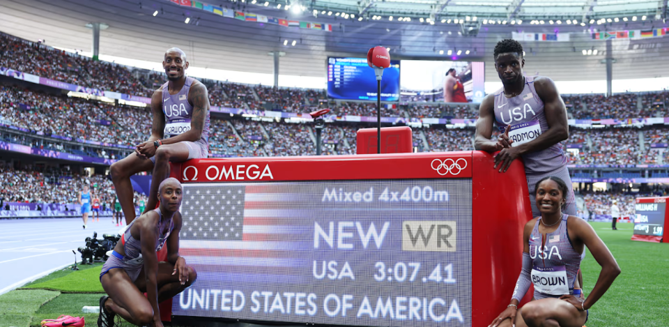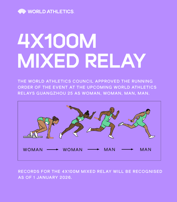2022年3月,世界田联开会,强制规定男女4x400米混合接力棒序改为:男女男女。巴黎奥运会男女混合4×100米接力预赛,美国队跑出3分07秒41,创造保持至今的世界纪录。