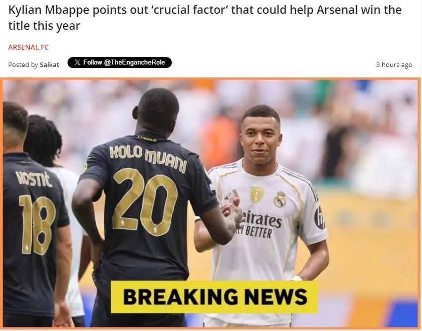 皇马球星姆巴佩近日接受图片报采访时表示,他看好阿森纳本赛季夺得英超冠军。