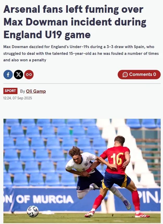 在英格兰u19对阵西班牙u19的比赛中,阿森纳神童道曼上半场就遭遇了10次犯规……