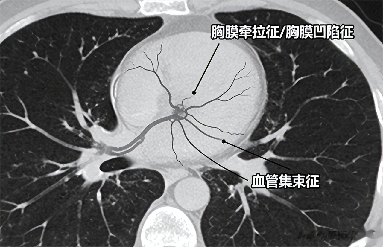 例如研究指出,影像上出现“胸膜牵拉征/胸膜凹陷征”和“血管集束征”与肺癌高度相关:这些征象表现为肿块牵拉胸膜或周围血管向病灶聚集,提示病灶具有侵袭性结构改变。