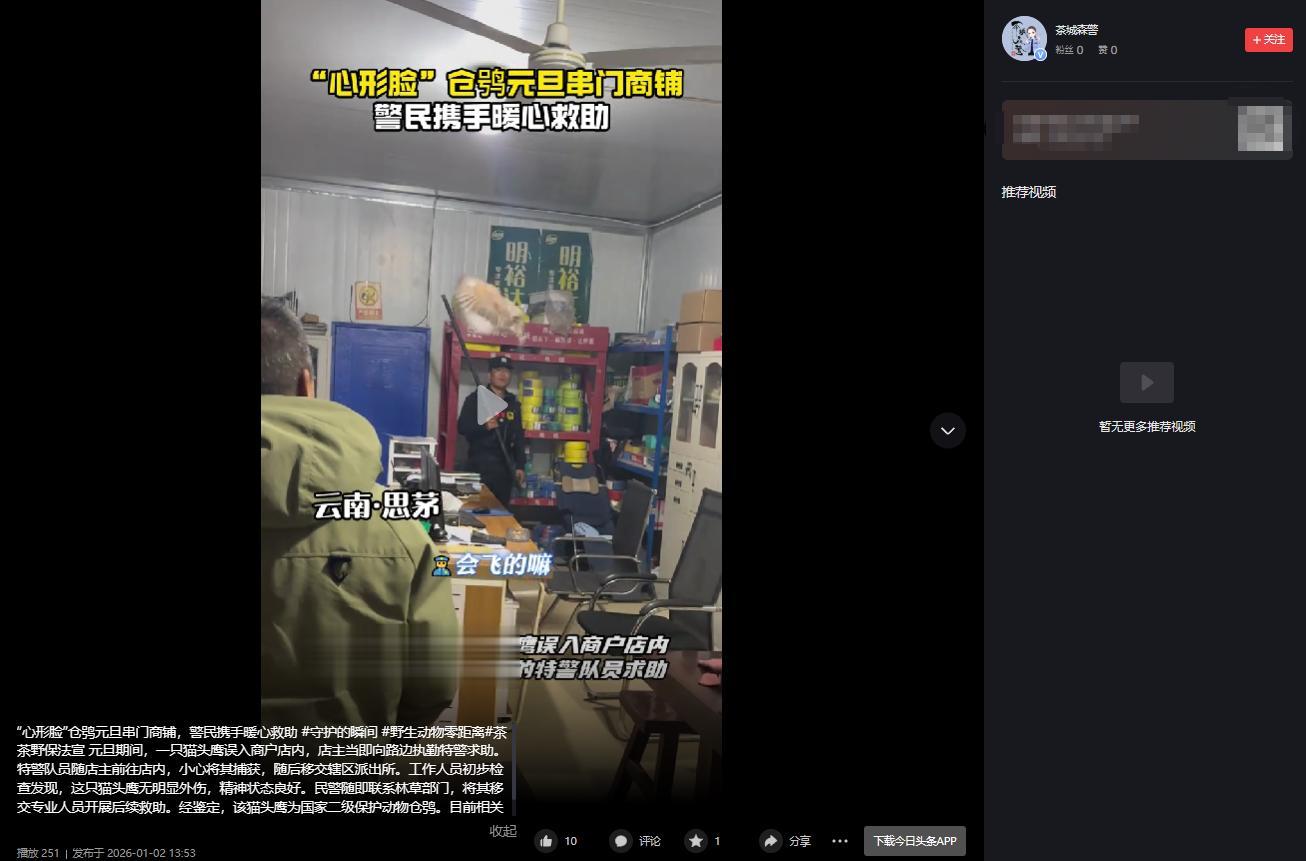 信息来源:茶城森警2026年1月2日《“心形脸”仓鸮元旦串门商铺,警民携手暖心救助……》