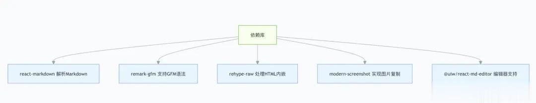 框架核心React 18(组件化开发,支持 Hooks)语言TypeScript(类型定义清晰,减少开发时的类型错误)构建工具Vite(热更新快,打包体积小)样式方案Tailwind CSS + tailwind-merge(原子化 CSS,灵活且避免样式冲突)Markdown 处理react-markdown + remark-gfm + rehype-raw(支持标准语法 + 扩展,比如表格、 strikethrough)截图功能modern-screenshot(轻量的 DOM 转图片库,比 html2canvas 更稳定)对于想二次开发的朋友,这个技术栈几乎没有学习门槛,代码注释也比较规范,很容易上手。