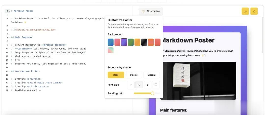 我第一次试用时,只写了几行 Markdown(标题、引用、列表 + 图片),点击生成就得到了一张带渐变背景、排版工整的海报,甚至支持一键复制成图片 —— 这对于经常需要在朋友圈、微博分享技术观点的我来说,简直是效率神器。