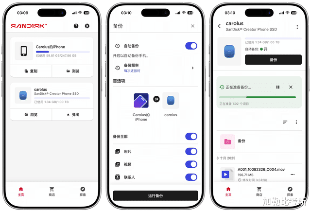 通过配套的Memory Zone APP,它可以设置将手机的照片、视频、联系人等数据,在连接状态下自动备份到闪迪创作者手机固态硬盘。