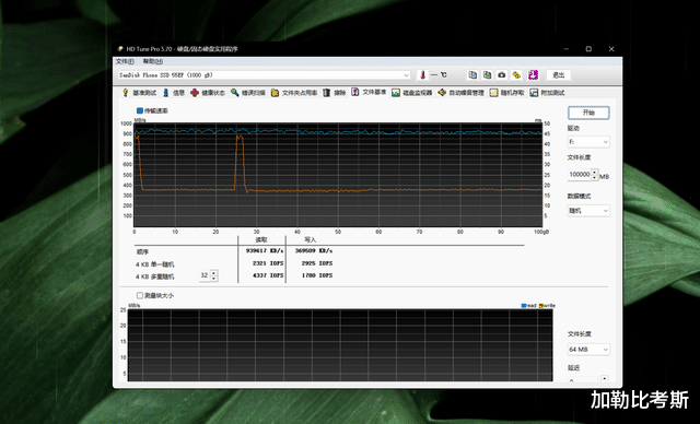 接下来我们使用HD Tune Pro测试闪迪创作者手机固态硬盘1TB的SLC Cache,数据模式选取随机,将数据块大小定为100GB,可以看到在单个100GB大小文件块传输下,无论是读写都十分平稳不掉速,这说明闪迪创作者手机固态硬盘1TB的主控性能表现十分稳定。