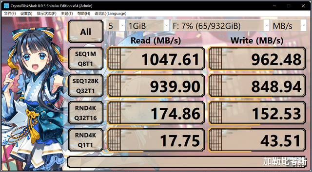 通过CrystalDiskMark测试闪迪创作者手机固态硬盘1TB在默认随机模式下的数据,在默认随机模式下得到连续读取速度为1047MB/s、连续写入速度为962MB/s。在单队列单线程4K小文件极端情况的读写性能测试中读取速度为17MB/s,写入速度为43MB/s。