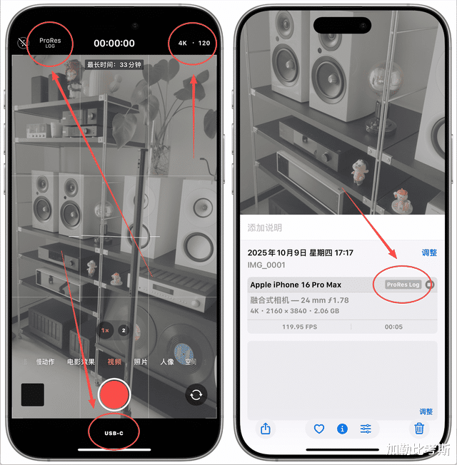 可以看到,由于我的是iPhone16ProMax,所以只显示ProRes,选择4K120Hz格式进行拍摄,可以看到拍出来的视频是ProRes Log格式,画面是灰片,极其适合后期调整,而且也可以看到这还只是ProRes格式,仅仅5秒钟的视频就使用了2.06GB。所以一分钟视频就24GB往上啦。ProReS Raw应该是更大的。