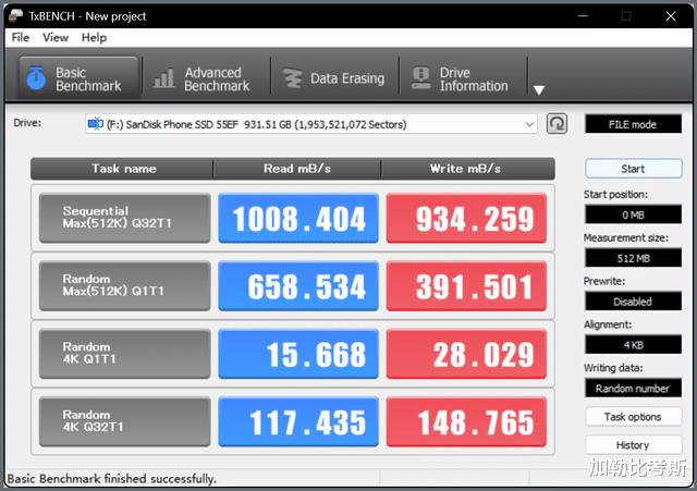通过TxBENCH测试闪迪创作者手机固态硬盘1TB在默认随机模式下的数据,在默认随机模式下得到连续读取速度为1008MB/s、连续写入速度为934MB/s。在单队列单线程4K小文件极端情况的读写性能测试中读取速度为15MB/s,写入速度为28MB/s,表现极为不错。