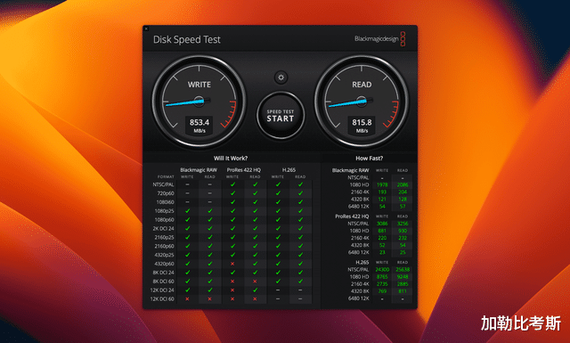 首先我们来使用Blackmagic Disk Speed Test进行测试,可以看到闪迪创作者的手机固态硬盘1TB的读取速度815MB/s,写入速度853MB/s,表现十分好。