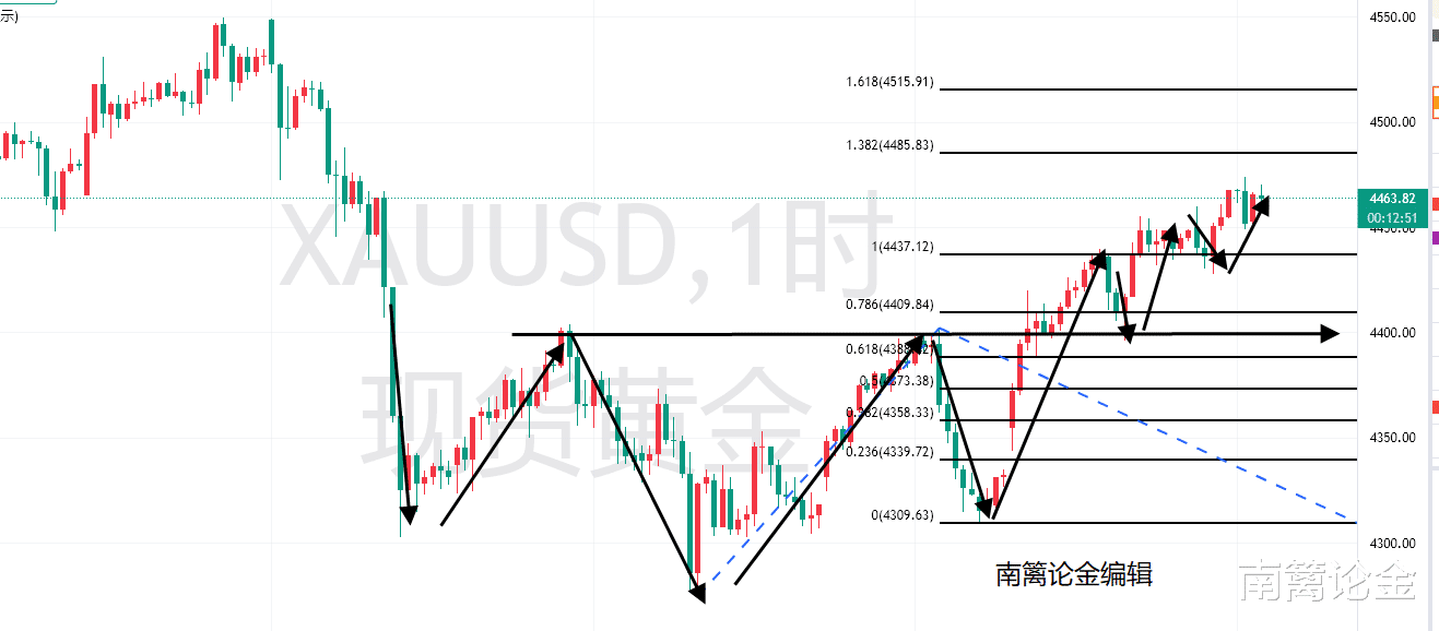 日常的参与呢,可以先去关注小时的布林带下轨,同时也是从4275拉起来的斐波那契扩展线的78.6%,大致4402—09。恰巧,昨天美盘期间呢,是去测试了一次,用来当成头肩底的颈线来用了,多重共振,这里可以说是不错的顶底转换。下方除了缺口外,更要关注4370—80的得失。