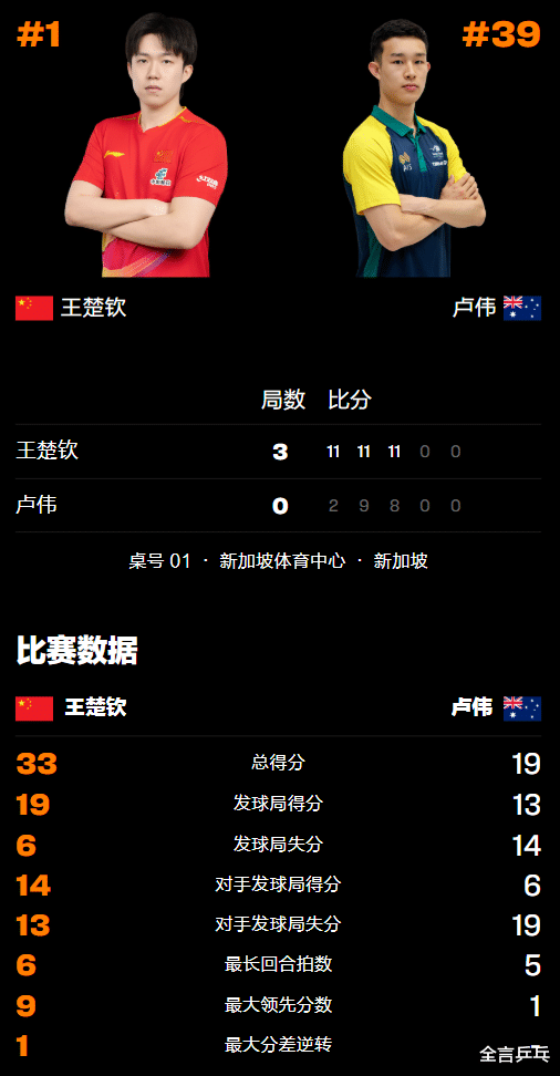 卢伟是澳大利亚乒坛的佼佼者,世界排名也已经达到第39的位置,但和排名第1的王楚钦相比显然差距甚远,此战实力悬殊,王楚钦被爆冷的可能性比较小。