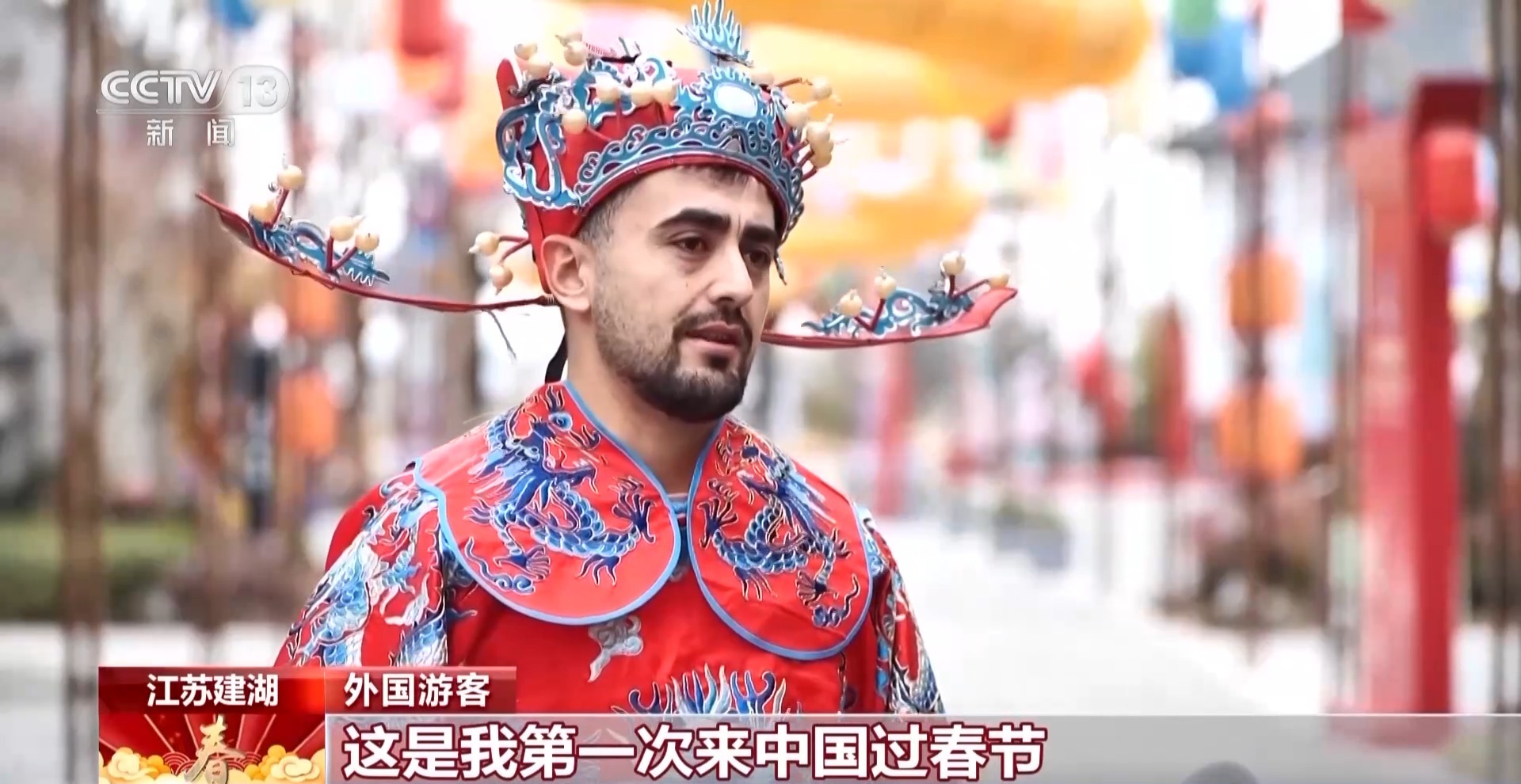 外国游客 伟力:这是我第一次来中国过春节,我喜欢中国文化,这个戏服设计也很有趣,展示了中国文化。