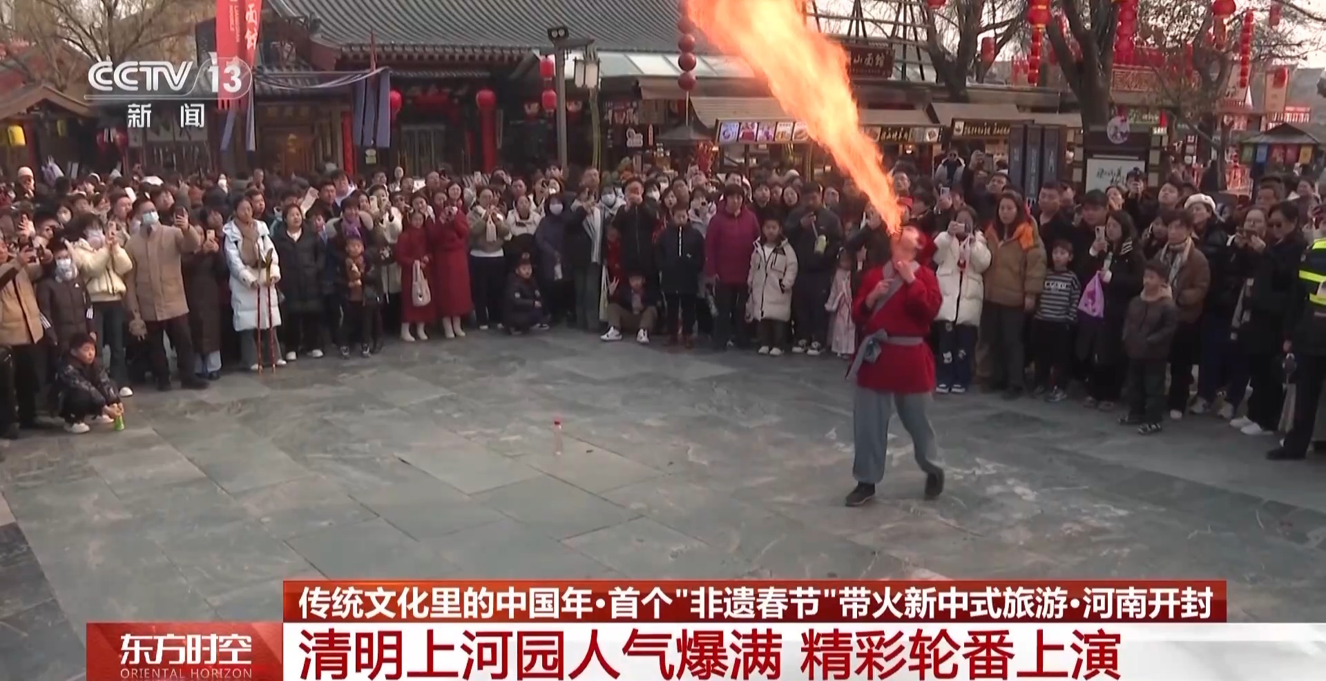 总台记者 田萌:我们现在所在的清明上河园就是按千古名画《清明上河图》打造而成的一个宋文化主题公园。工作人员告诉我们,春节期间,这几天园区的接待量都保持在高位。现场我们看到的是绝活表演——喷火,师傅的动作非常轻松自如,但瞬间能喷出来两到三米长的火龙,人群里都在惊呼和鼓掌。舞龙的队伍腾挪辗转,传说中龙可以行云布雨,大家通过这样的演绎,祈求来年风调雨顺,五谷丰登。再往这条街上看,整个一条街都是非遗展示,面人、糖画、汴绣、糖人还有宋式点茶等,今年是蛇年,工作人员在茶汤上都拉出了小蛇的图案,祝愿大家巳巳如意,生生不息。