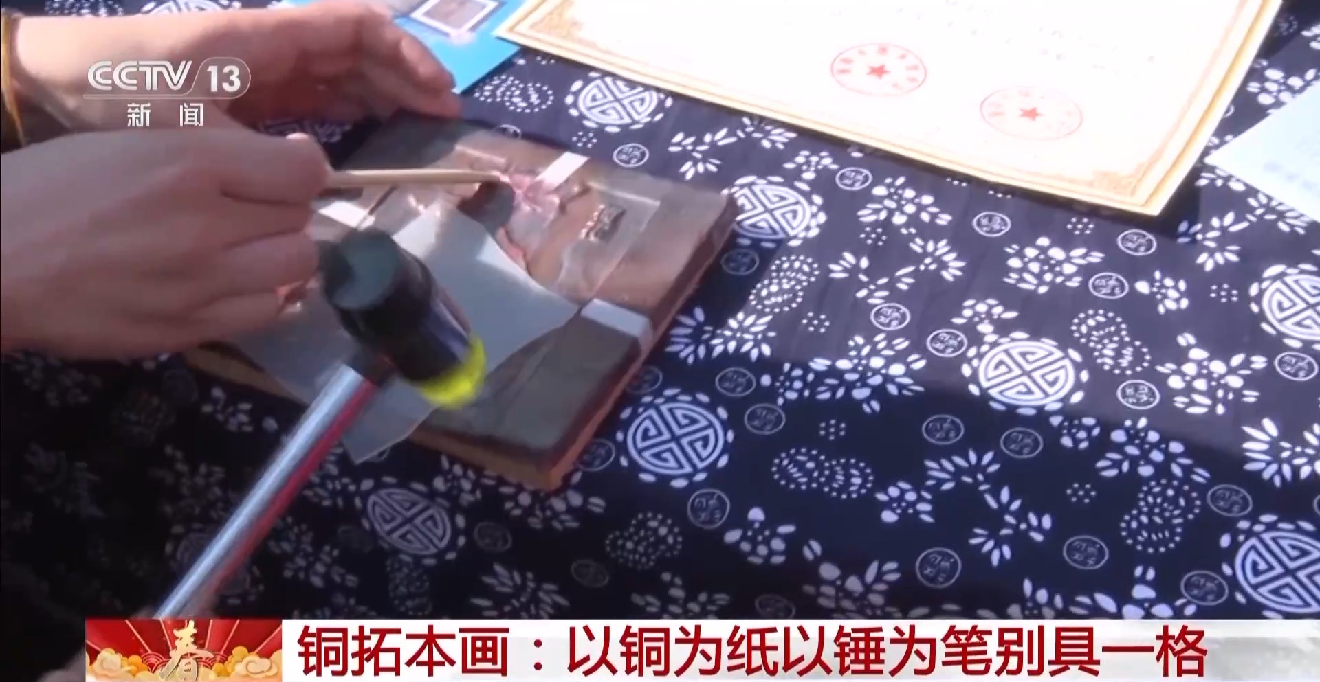 总台记者 刘军:在安徽省铜陵市义安区的犁桥水镇,在春节期间设置了非遗市集,让大家近距离感受传统技艺的魅力。我们现在看到的是铜拓本画,师傅将铜板覆盖在事先制作好的木模版上,然后通过小锤反复敲打,把图案拓印到铜板上,一幅精美的铜拓本画就呈现在眼前。铜陵因铜得名,铜文化源远流长,铜拓本画就是以铜为纸、以锤为笔,将人们的构思在铜板上呈现,形成独具一格的作品。