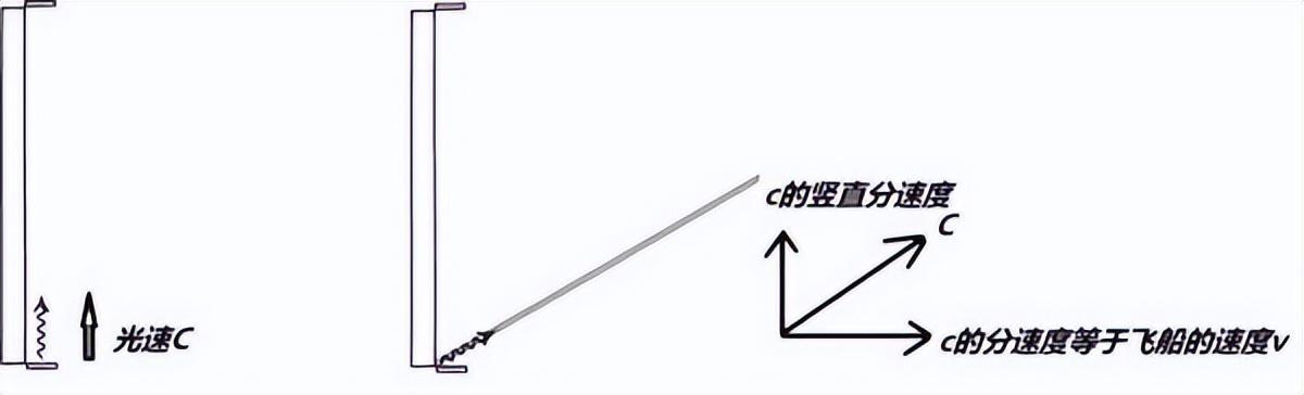 由于光速不变,飞船上光钟斜线的运行轨迹要大于光钟上下来回摆动的运动轨迹。