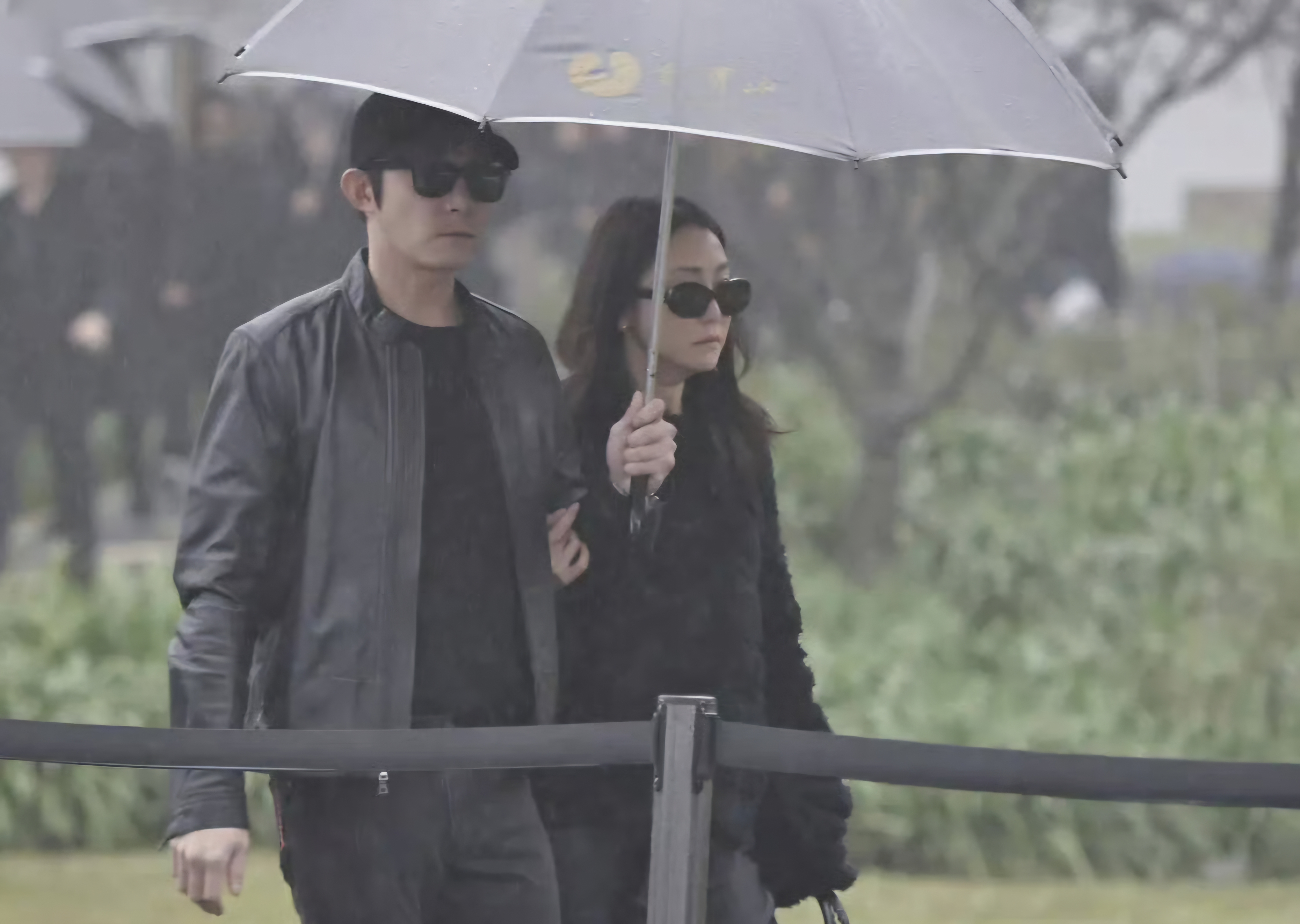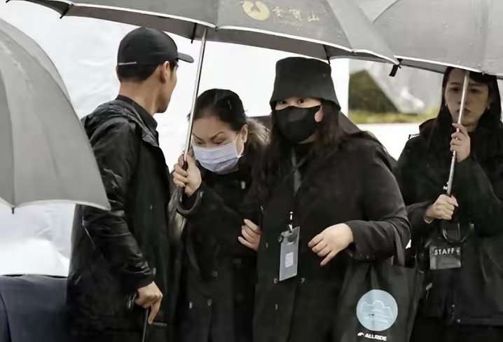 大S的母亲黄春梅挽着女婿具俊晔的手臂,两人同撑一把伞神情哀伤, 妹妹徐熙娣看起来比妈妈还要悲痛,需要在老公许雅钧的搀扶下才能踉跄前行。