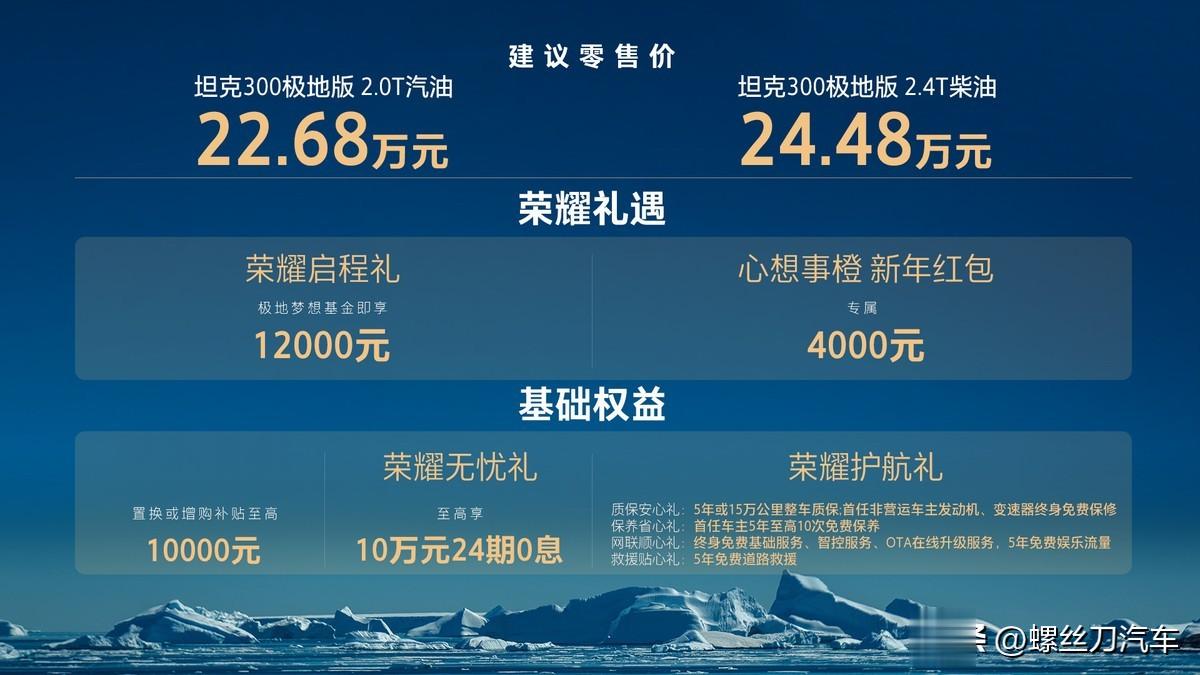 12月11日,在坦克300全球用户达成50万之际,坦克300极地版正式上市。官方建议零售价,坦克300极地版2.0T汽油22.68万元,坦克300极地版2.4T柴油24.48万元,并推出荣耀启程礼、心想事橙新年红包和多项基础权益等多重购车礼遇。