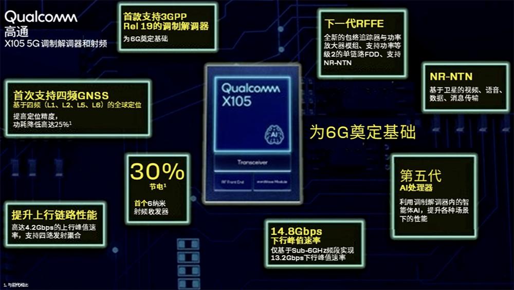 高通X105平台引入多项行业首创特性,包括:首个6nm射频收发器,相较前代功耗降低高达30%,占板面积减少15%;首个四频(L1、L2、L5、L6)GNSS引擎,集成多星座支持,并提升定位精度。