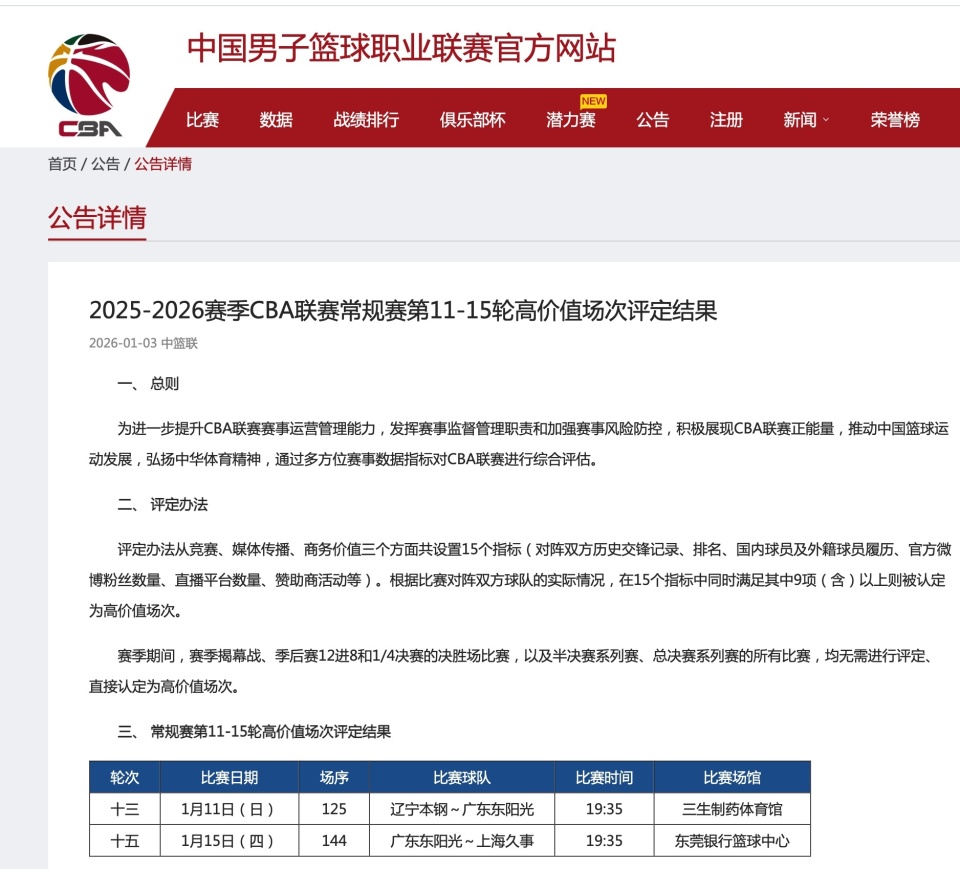 CBA公司官方刚刚公布了2025-2026赛季常规赛第11轮至第15轮的“高价值场次”评定结果。广东宏远男篮成为了绝对的主角,入选的两场比赛全部与华南虎有关。所谓的“高价值场次”,并非仅仅依据球队目前的积分排名来简单划定。根据CBA官方公布的评定办法,这是一套包含了竞赛、媒体传播、商务价值三大板块共计15项指标的复杂计算模型。这种评定机制实际上是在用大数据的手段,筛选出那些能够真正打破圈层、引发全民关注的顶级对抗。