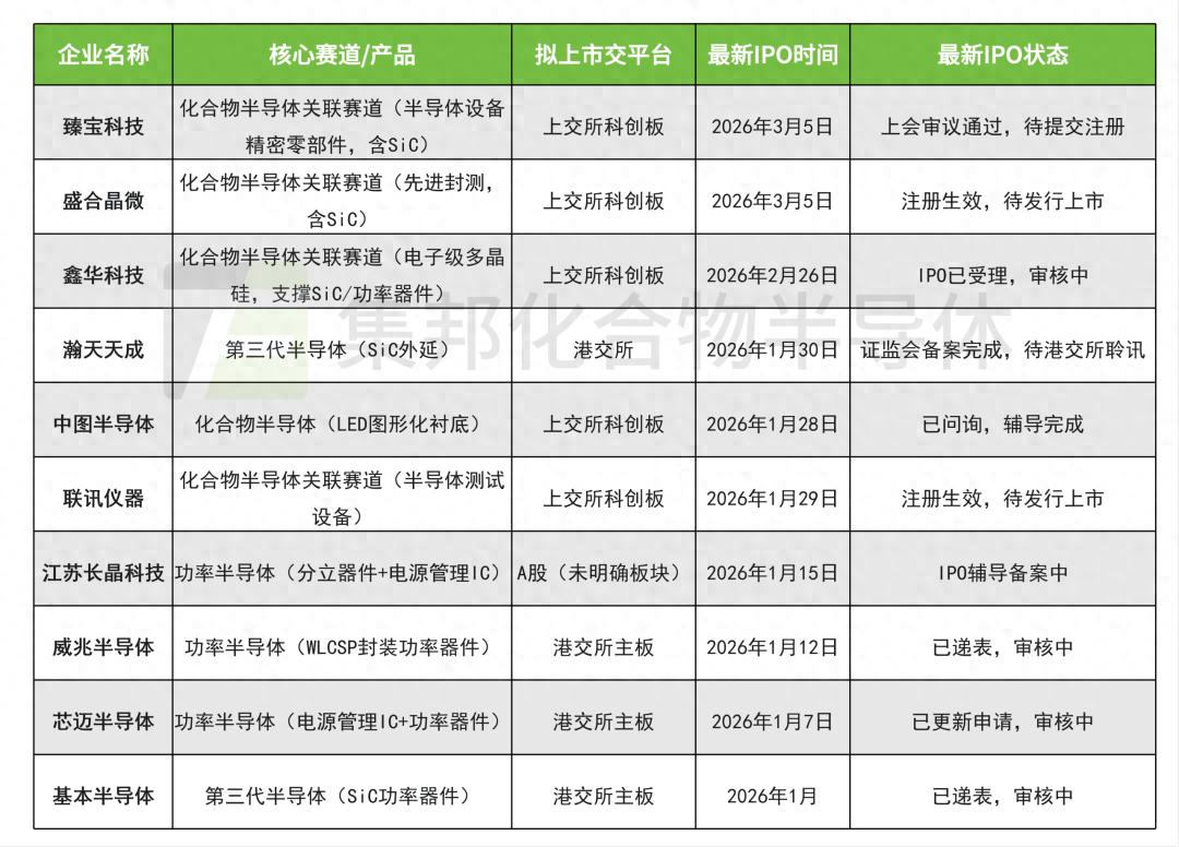 2026年开年以来,国内第三代半导体、化合物半导体、功率半导体及关联赛道企业迎来IPO热潮,10家重点企业密集推进上市进程,涵盖芯片设计、先进封测、核心材料、设备零部件等关键环节。多数企业获得产业资本加持,华为哈勃、大基金二期、小米、宁德时代等纷纷布局。
