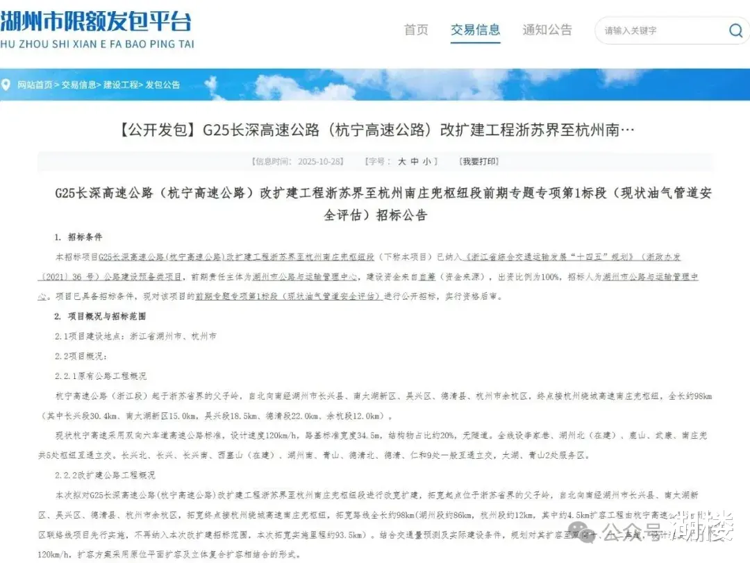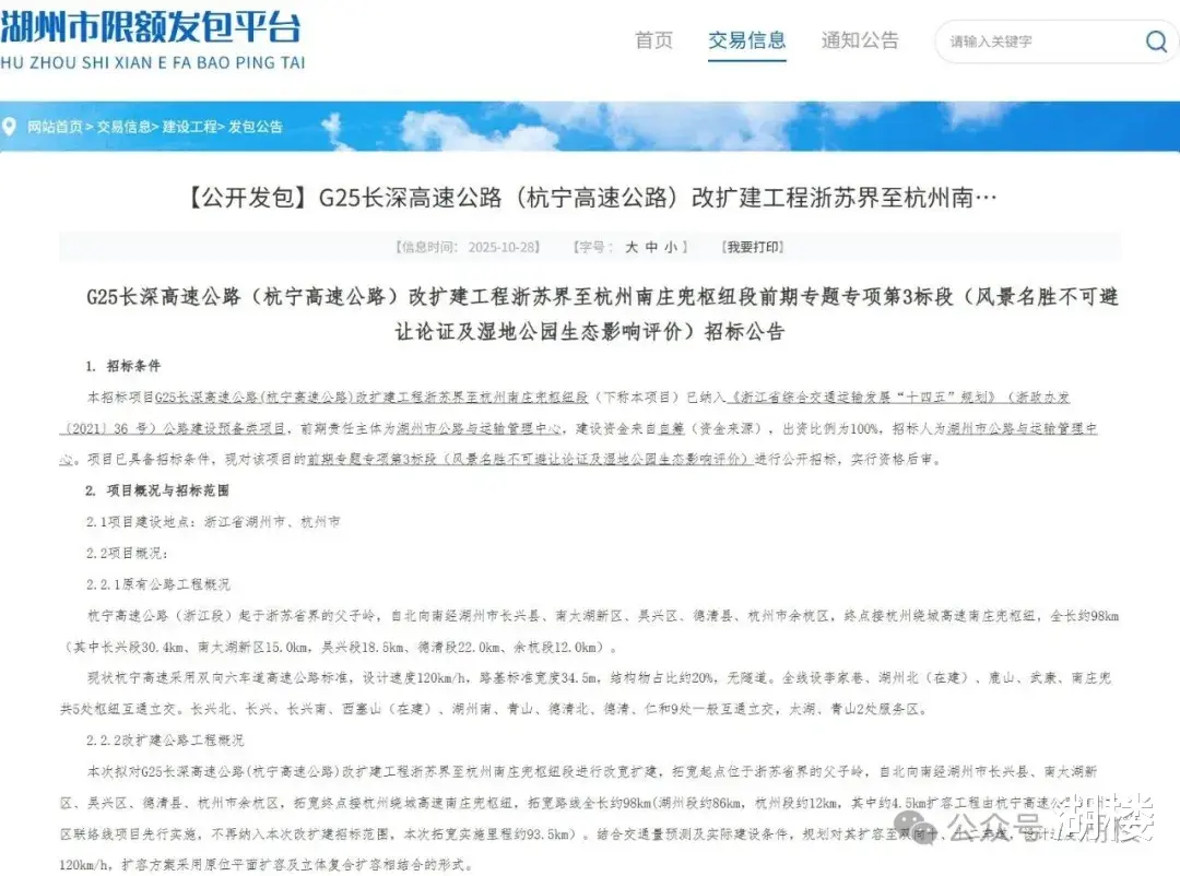 10月28日,G25长深高速公路(杭宁高速公路)改扩建工程浙苏界至杭州南庄兜枢纽段前期专题专项第1标段、第3标段招标公告发布。