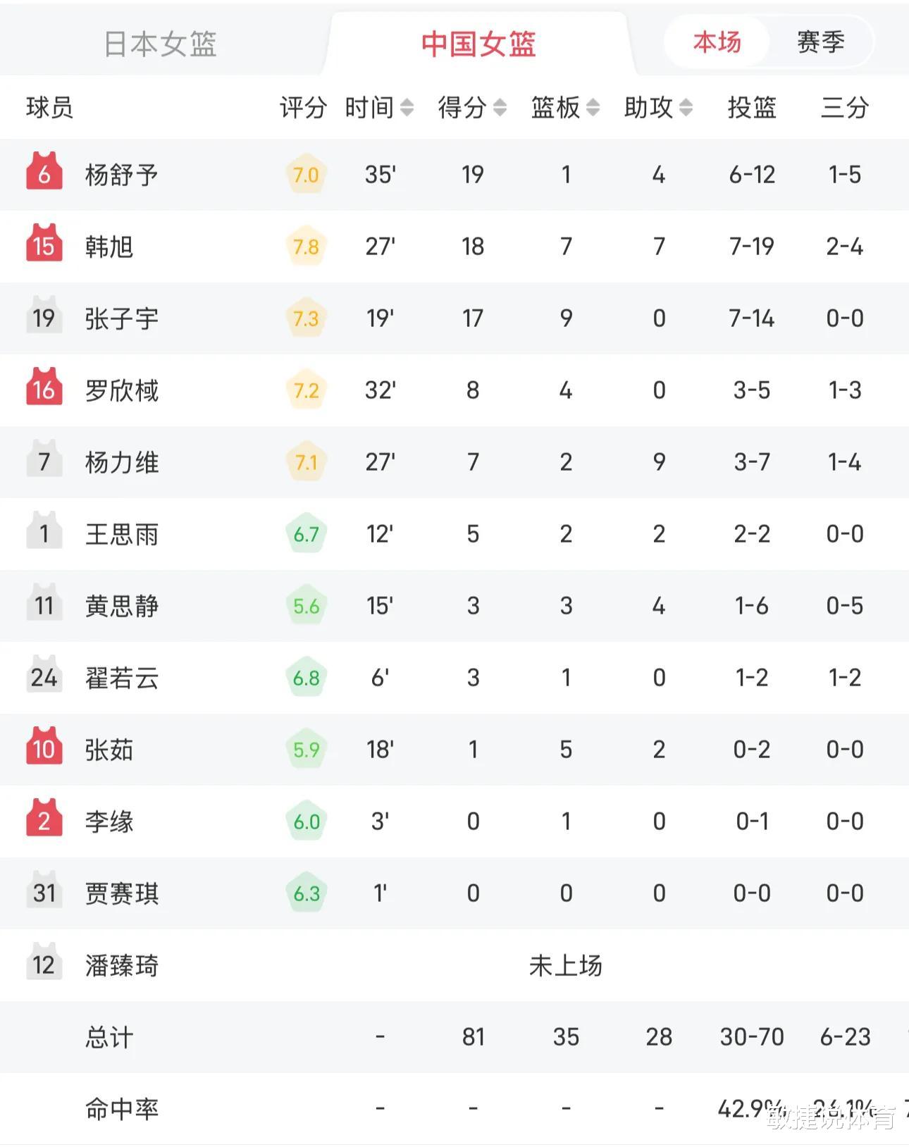 中国女篮得分3人上双,杨舒予19分、韩旭18分7篮板、张子宇17分9篮板,3分命中率非常惨淡,总共23投6中,其中黄思静5投0中。日本田中心砍下27分,日本3分34投16中,全民投手。