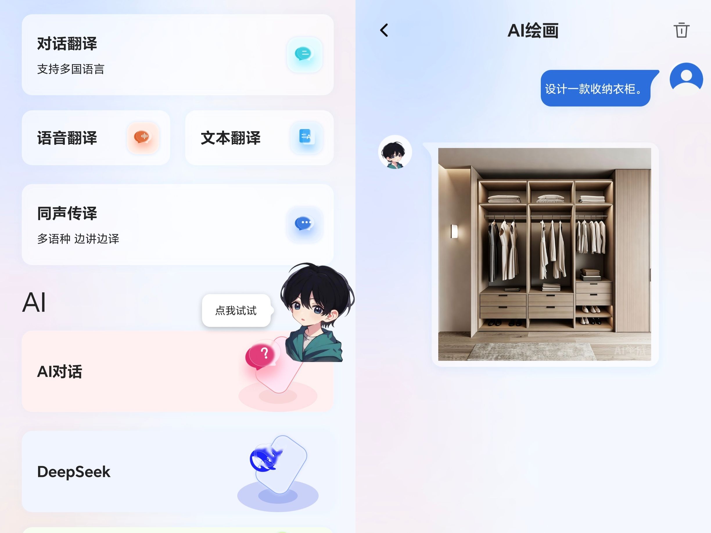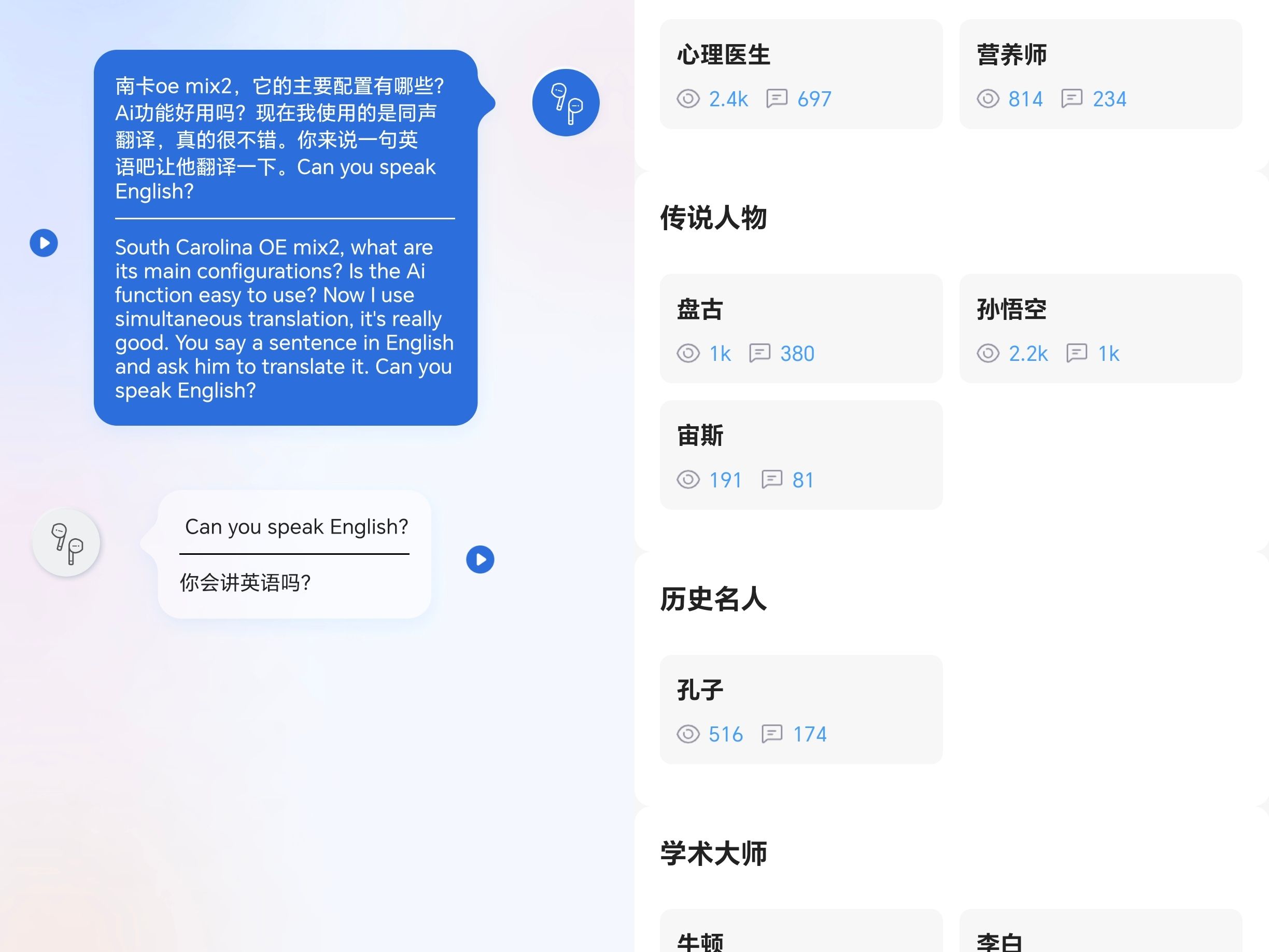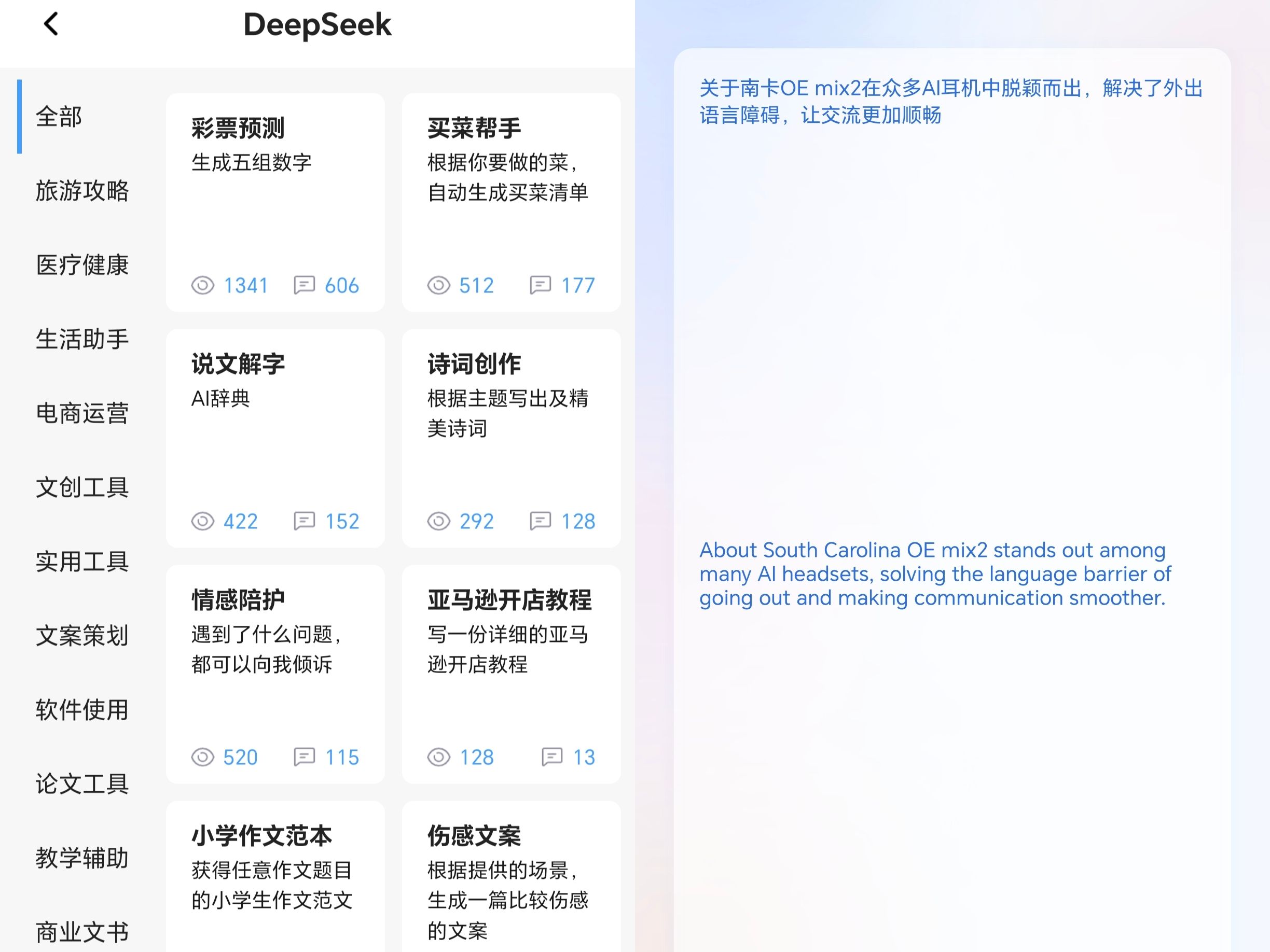 南卡OE Mix2内置的AI智能系统集成了讯飞、DeepSeek等主流引擎,支持语音翻译、AI对话、图像生成、写作辅助等十余项功能,并通过专属APP实现个性化定制。日常使用中,AI功能的实用性远超预期: