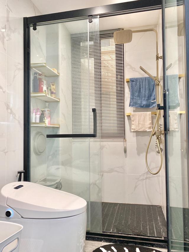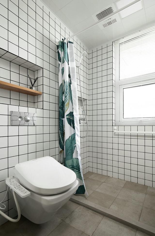 在淋浴区内部,可以再用浴帘和挡水条的搭配,增加干湿分离的效果,也方便开合和清洁。这种设计既能保证卫生间的通透感,又能有效地隔绝水汽,让卫生间更干爽舒适。