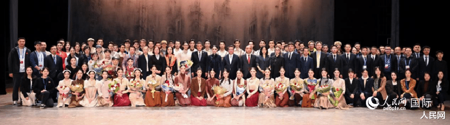 中国驻朝鲜使馆与中国上海艺术团合影留念。 人民网记者 刘融摄