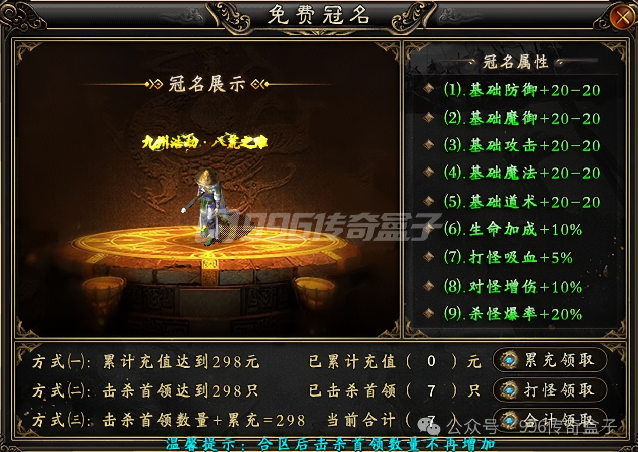 万年树妖的活动也很意思,这个不是打死才会掉东西,每下10%的血,就会掉落四到五个斗笠、勋章、战鼓。打死后随机爆黄金斗笠、勋章或者战鼓。虽然说这些东西可以用元宝进行合成,但不建议,毕竟元宝虽然不难获得,但需求量太大。前期建议优先开启赞助,可以获得职业的高阶技能以及属性加成。还有怪物攻城,这个活动全服的首杀首爆都能获得,赤月老魔最好合成血石,高几率出稀有以上装备!