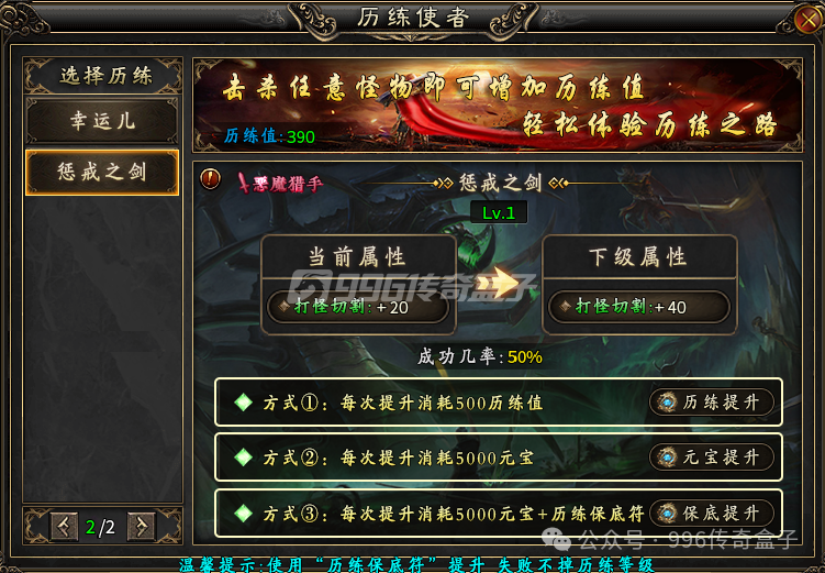 历练使者有很多需要提升的,每个都加不同的属性,可以仔细研究研究,其中惩戒之剑加切割,优先提升这个。提升的方式有三种,第一种历练提升,这个是免费的,历练值刷怪可以获得。第二种消耗元宝提升,第三种消耗元宝和历练保底符。都是鬼服了,当然是免费优先,所以我也不说什么建议了,你就用历练值免费提升!而且提升是有成功概率的,失败会掉等级,所以就用历练值免费提升,失败了就再去刷怪,也不心疼,就是命苦点。