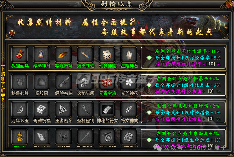 除了活动,这里要先恭喜收集爱好者,有两个收集玩法,一个是最常见的装备图鉴。刷怪掉落装备免费激活,可以获得属性。黄金赞助会送一个祖玛套图鉴全满的福袋,所以元宝优先用来领赞助。还有一个收集玩法是剧情收集,任意怪物掉落,但我感觉BOSS爆率会更高,点亮可以获得属性。不知道是不是我的运气好,不管是装备还是剧情材料,爆率都不错,这种紧凑的爆装成就感让人很上头!