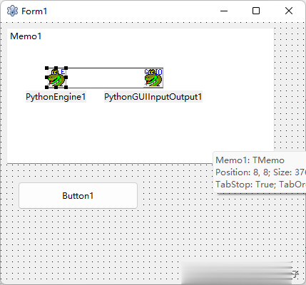 组件配置.....在新建的Lazarus项目中,从组件中拖入TPythonEngine和TpythonGUIInputOutput组件到窗体,还有一个TMemo组件用于显示Python输出。