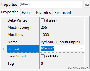 ......在PythonGUIInputOutput1组件的属性设计器中,把Output属性设置为我们拖入的Memo组件。
