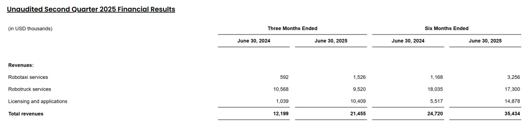 第二季度,小马智行的Robotaxi服务收入为1090万,同比大增157.8%,但仅占总营收的7%;Robotruck服务则达到6820万,但同比下滑了9%;此外还有技术授权与应用,收入为7460万,同比增了9倍。