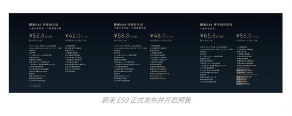 (4月 9 日,杭州)科技行政旗舰 SUV——蔚来 ES9 在杭州正式发布并开启预售。ES9 是蔚来十一年体系创新的集大成之作,是智能电动行政旗舰 SUV 品类的开创者。ES9 行政豪华版预售价 528,000 元起,采用 BaaS 电池租用方式购买,预售价 420,000 元起;行政签名版预售价 588,000 元起,采用 BaaS 电池租用方式购买,预售价 480,000 元起,地平线特别版预售价 658,000 元起,采用 BaaS 电池租用方式购买,预售价 550,000 元起。