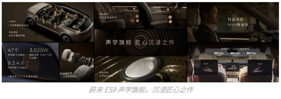 ES9 搭载九霄天琴 9.2.4.8 沉浸声系统,拥有行业最多 47 个扬声器、行业最高 3,020W额定功率及行业首创原生声学布局。首次搭载以 100%纯钻石打造的「天琴钻石高音」单元,配合蔚来独享数字声学技术,将座舱打造成顶级移动音乐厅。ES9 拥有行业顶级 NVH 表现,在 120km/h 时速下,车内噪音仅为 59.2 分贝。ES9 更拥有全球首个获得全舱杜全景声、杜比视界认证并支持杜比动态视频增强的「三杜比」座舱影院,将视听享受推向新高度。
