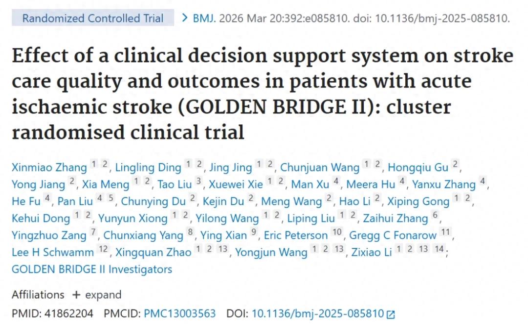 急性缺血性卒中(AIS)是全球致死、致残的主要原因之一,其诊疗效果高度依赖临床实践与循证指南的契合度。然而,在实际工作中,诊疗流程复杂、医护人员认知差异等因素常导致指南依从性不足,进而影响患者预后。为解决这一临床痛点,首都医科大学附属北京天坛医院王拥军院士、李子孝教授牵头开展了GOLDEN BRIDGE Ⅱ研究,旨在验证基于人工智能(AI)的卒中临床决策支持系统(AICDSS)对AIS患者诊疗质量及长期预后的改善效果,为AI技术在卒中诊疗领域的应用提供高质量循证依据,相关研究成果发布于BMJ。