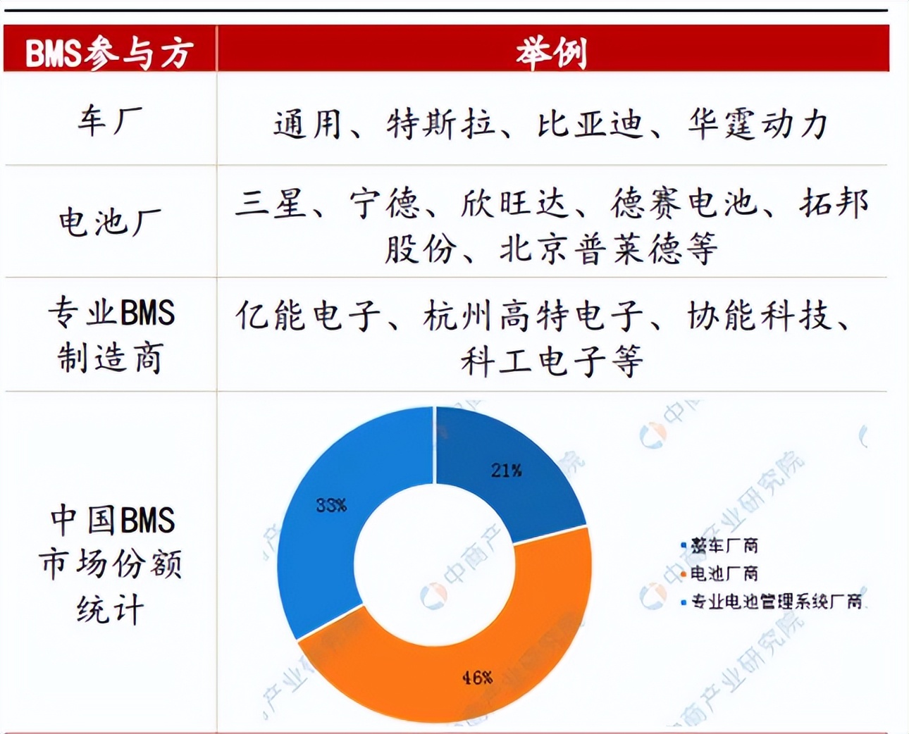 目前BMS制造产商主要包括车厂、电池厂与专业BMS制造商。与动力电池的BMS主要由终端车厂主导不同,储能电池的终端用户没有加入BMS研发与制造的需求;目前储能BMS没有形成领导者,根据中商情报网统计,专业电池管理系统厂商市场份额占比约为33%。