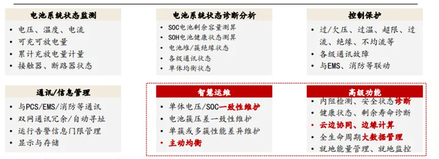 2)目前BMS功能已经由监测、通讯、保护、显示、存储等基本功能向电池系统安全诊断和长寿命运维、系统经济性指标诊断等高级功能发展。