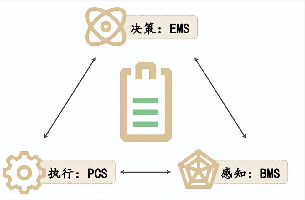 在储能系统中,电池组将状态信息反馈给电池管理系统BMS,BMS将其共享给能源管理系统EMS和储能变流器PCS;EMS根据优化及调度决策将控制信息下发至PCS与BMS,控制单体电池/电池组完成充放电等。
