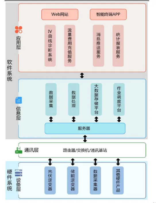应用层:表现形式包括APP、Web等,为管理人员提供可视化的监控与操作界面,具体功能涵盖能量变换决策、能源数据传输和采集、实时监测控制、运维管理分析、电能/电量可视分析、远程实时控制等。